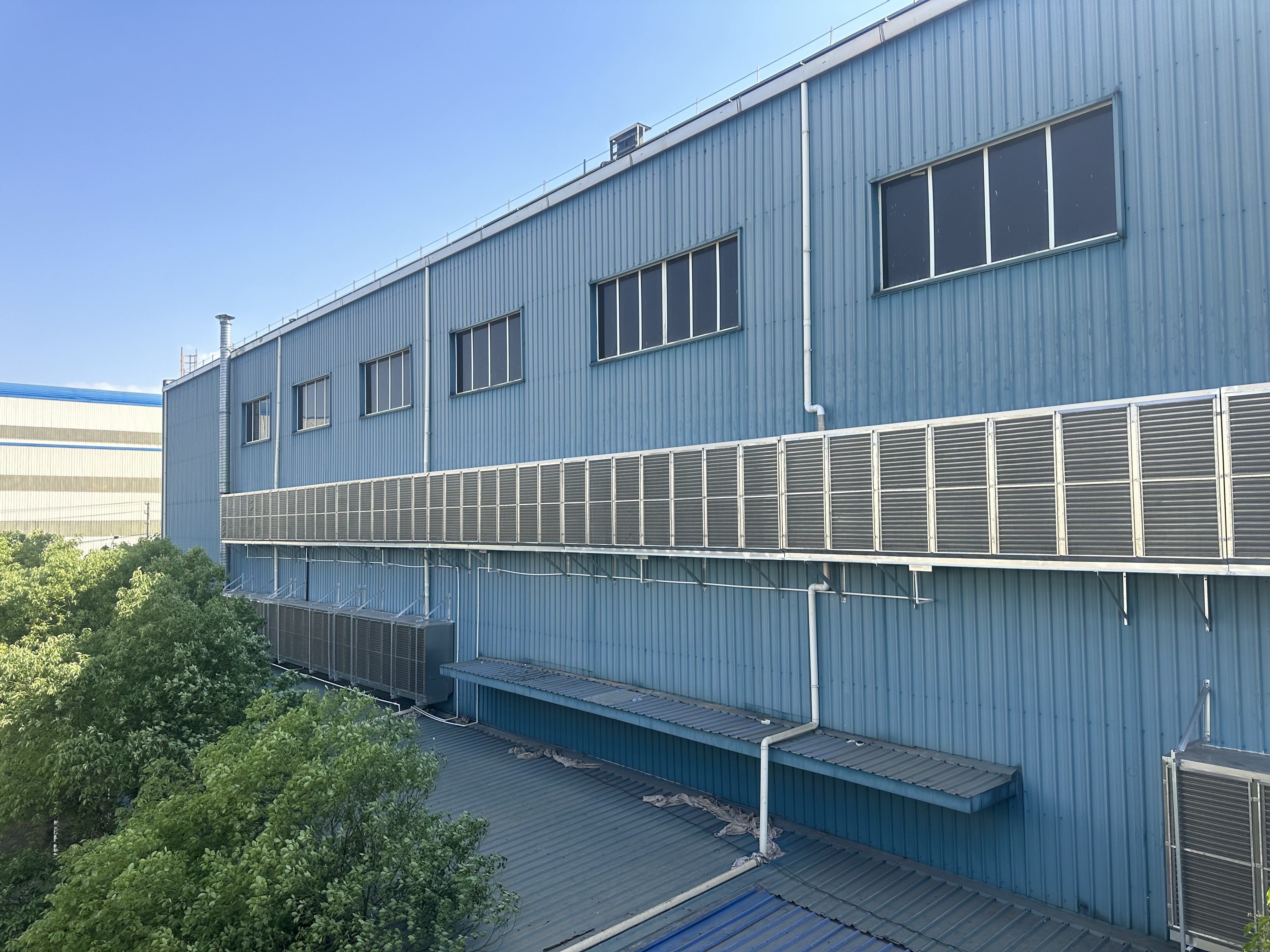 技术聚焦:针对高大跨度车间的“高温+通风”双重痛点,研发“蒸发-新风-节能”三位一体技术架构,蒸发式冷气机可实现10-15℃快速降温(环境38℃时),同时保持20-30次/小时空气置换,能耗仅1.5-2.2kW/台(比传统空调省电80%);